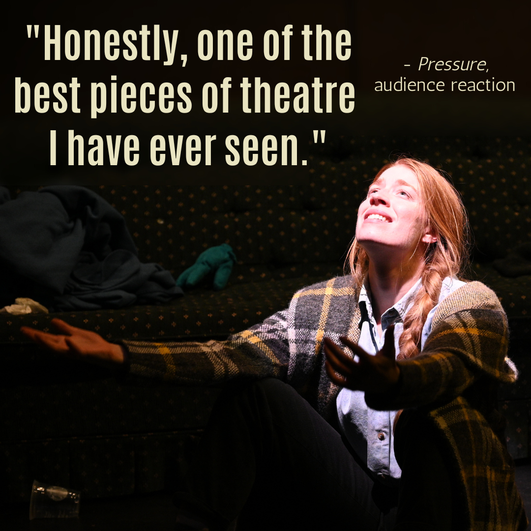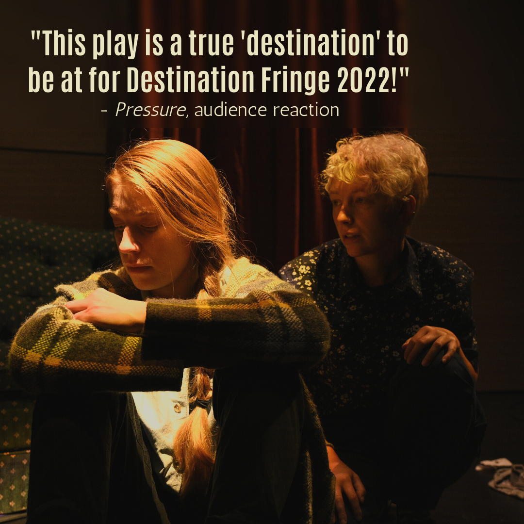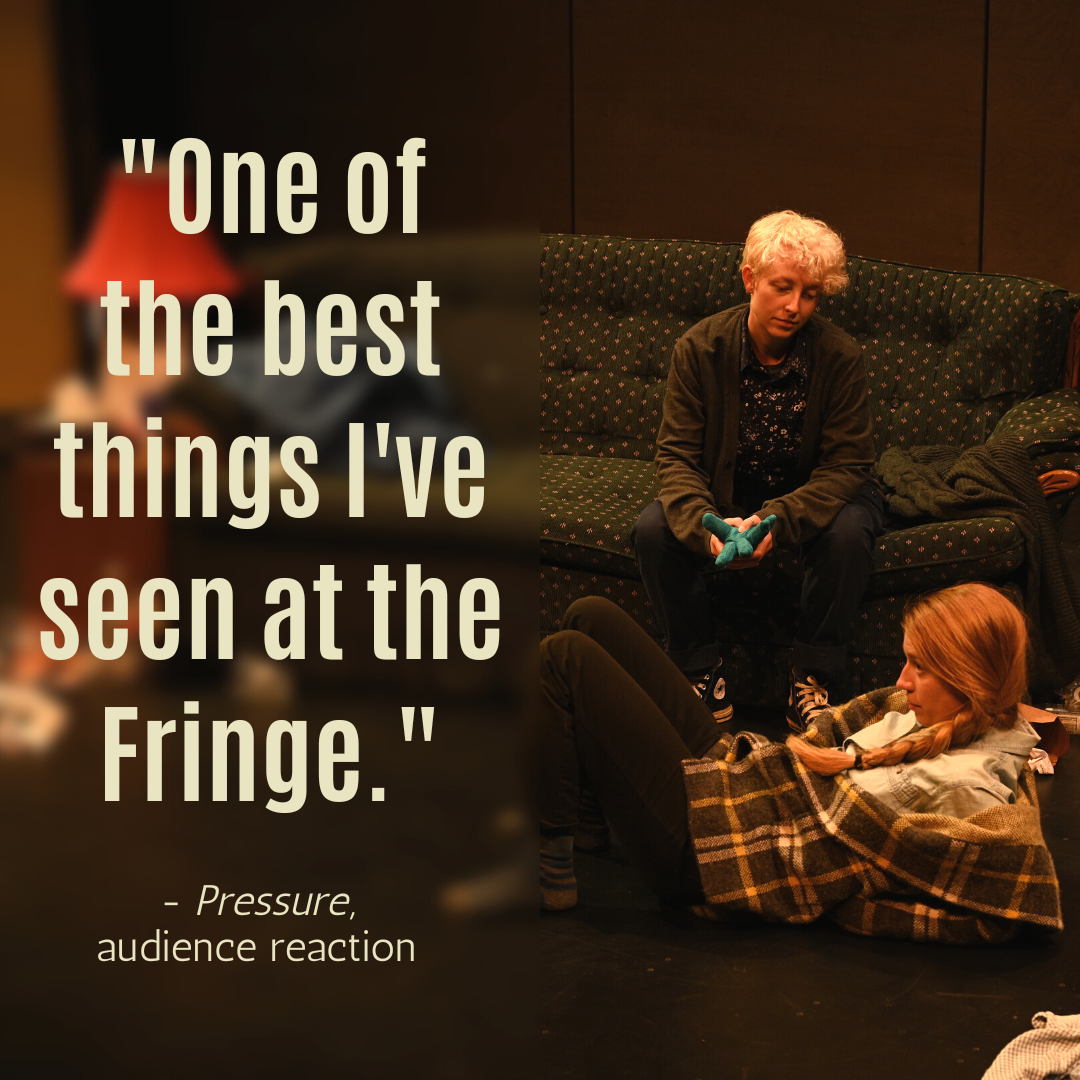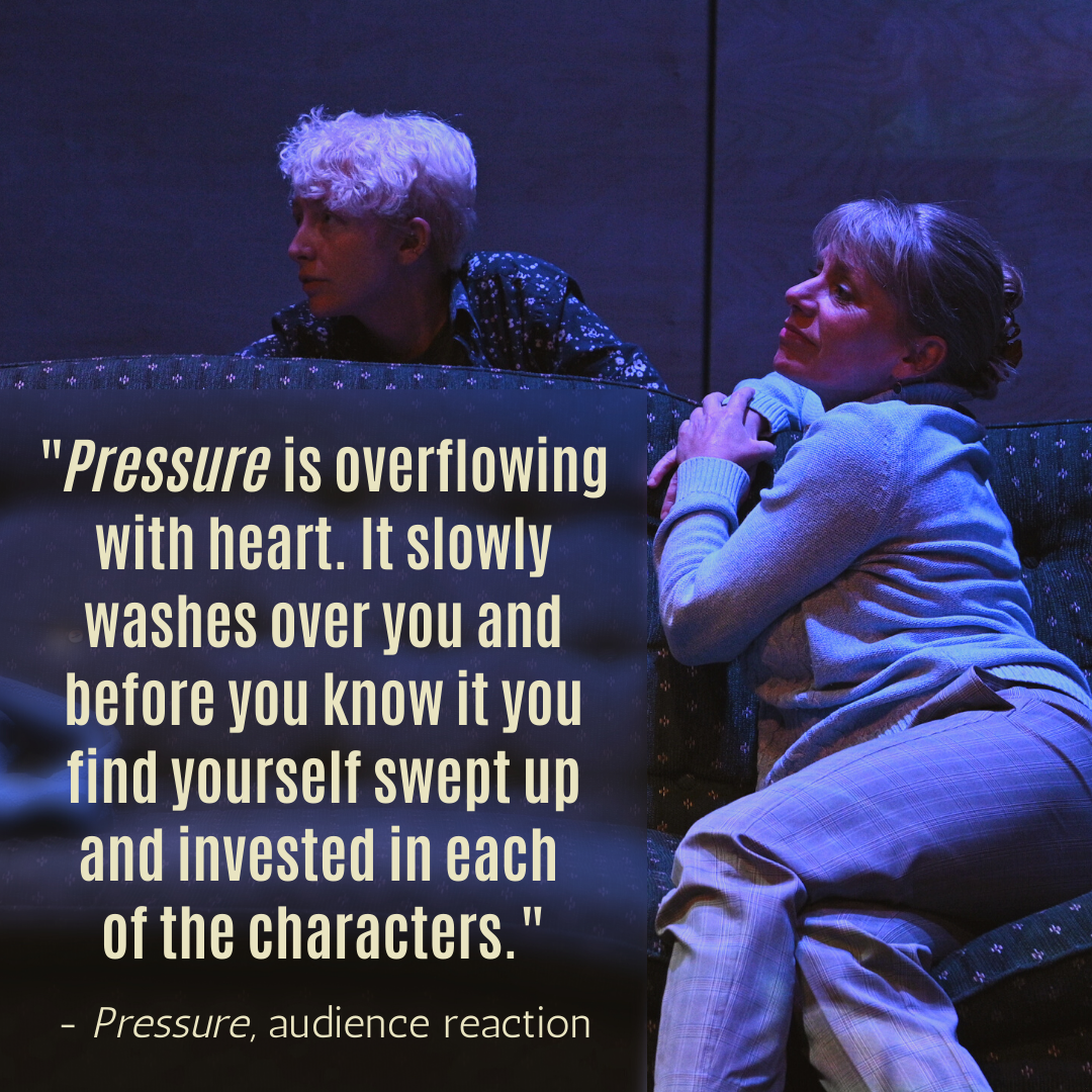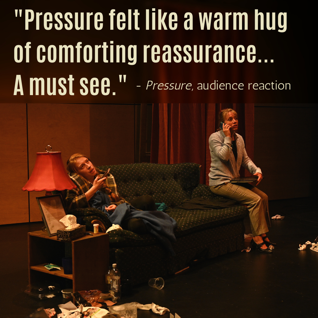 “Pressure, a new and convincingly tough-minded play by the up-and-comer Amanda Samuelson, premiering at the Fringe as Nextfest’s first official cross-festival foray, looks for a theatrical way to explore depression. And the spikiest of the insights it sets forth might well be that the loving concern of everyone around Grace (Sydney Williams) — her stellar mom (Sue Huff), her patient partner and soon-to-be ex Ricky (Meegan Sweet) — who do everything right and are standing by, hands outstretched, are pressure too.” — Liz Nicholls: 12th Night, Fringe Review