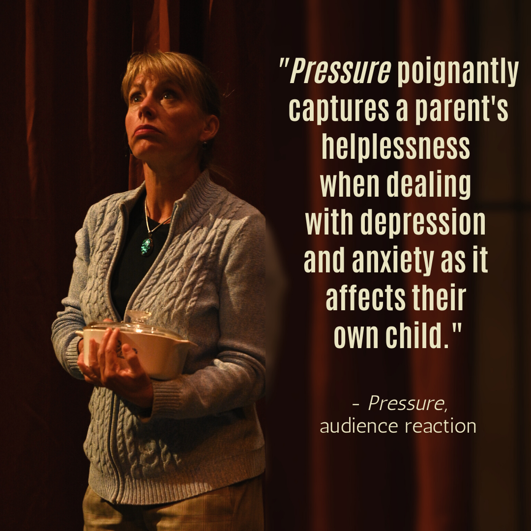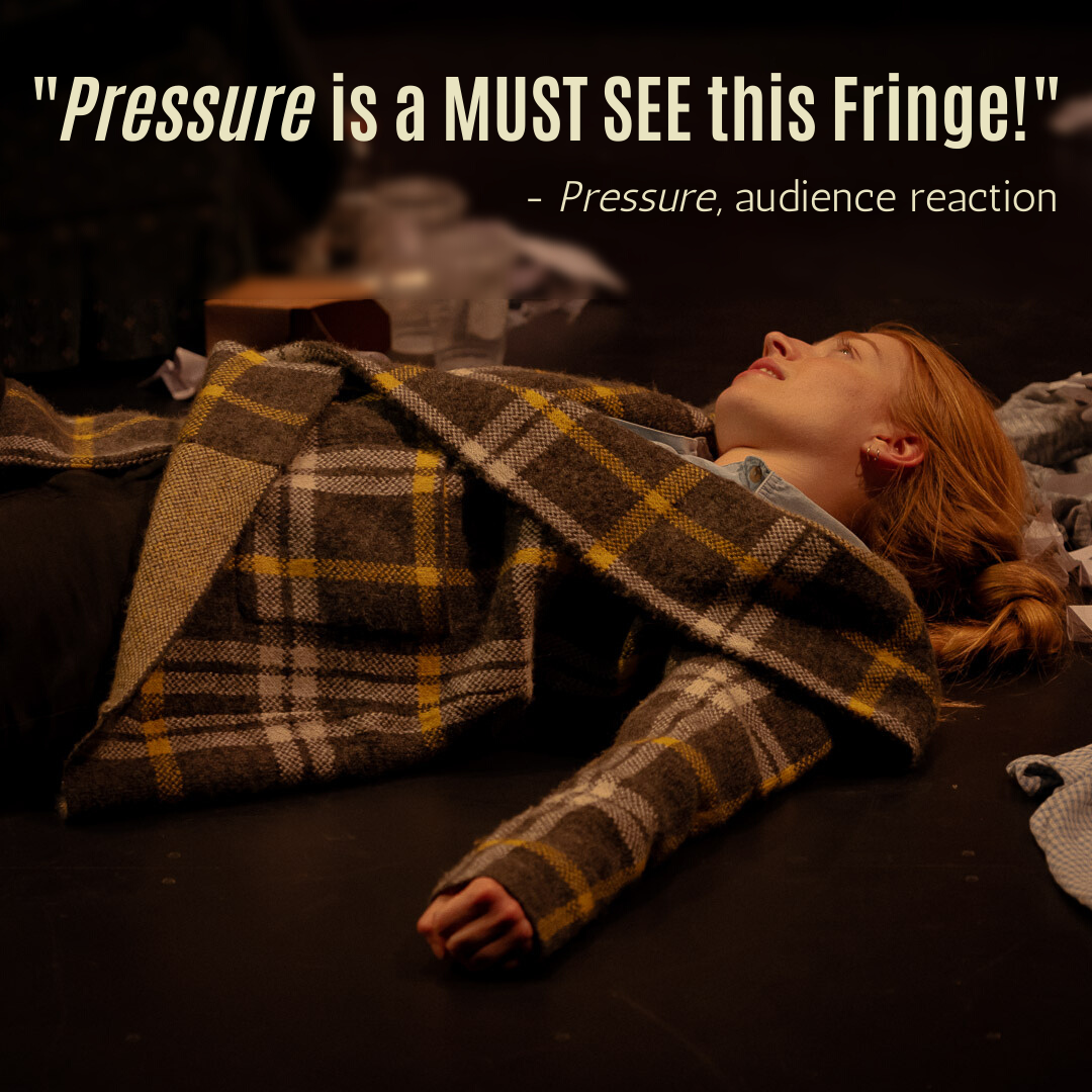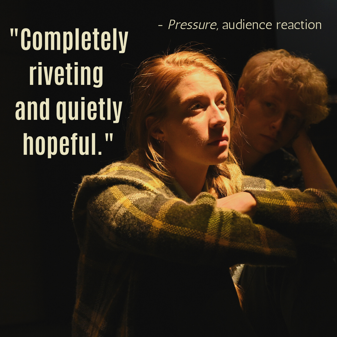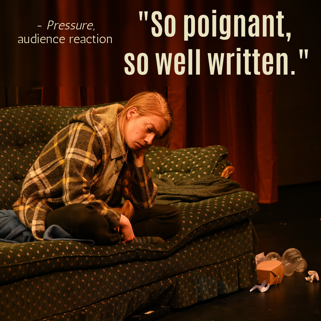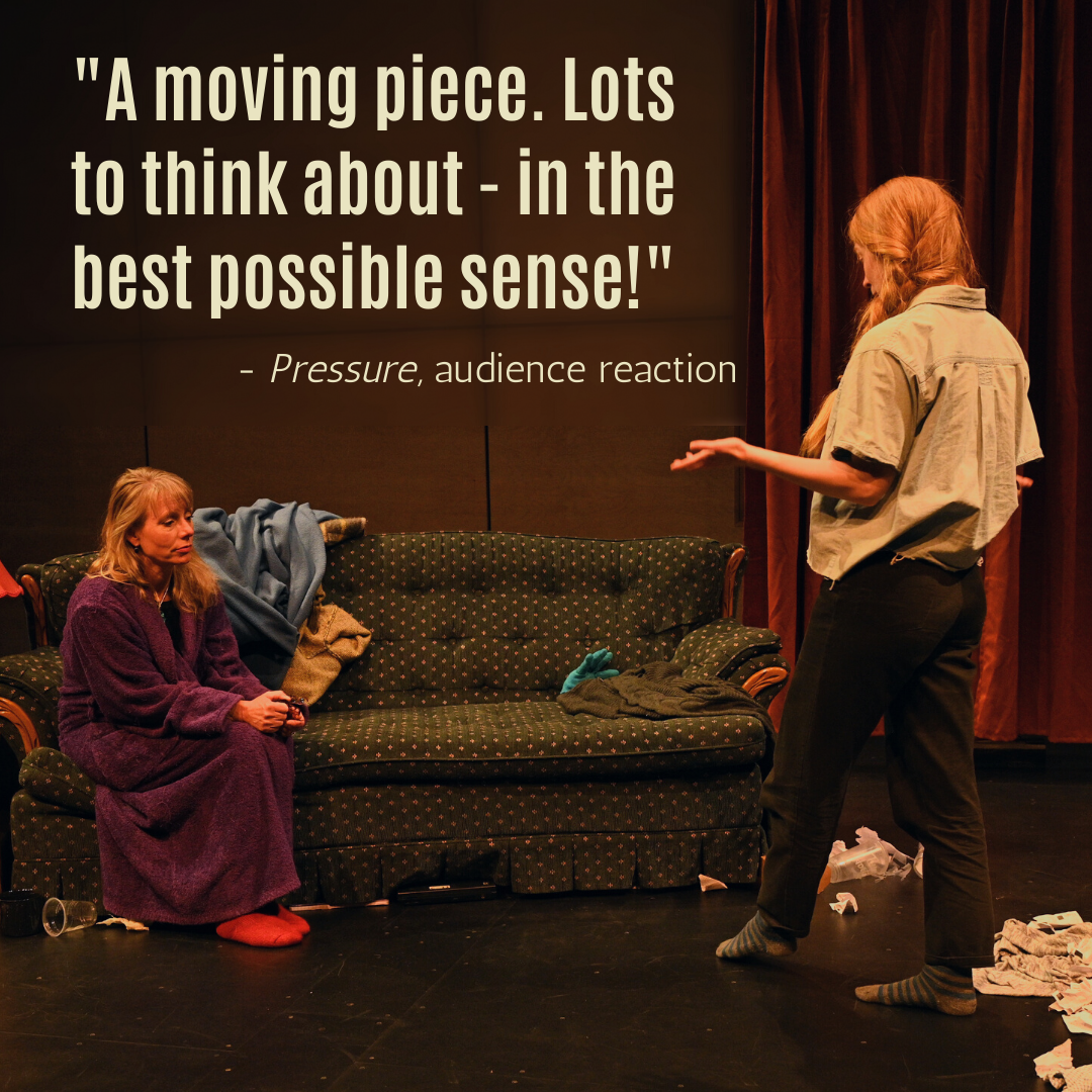 “Pressure, a new and convincingly tough-minded play by the up-and-comer Amanda Samuelson, premiering at the Fringe as Nextfest’s first official cross-festival foray, looks for a theatrical way to explore depression. And the spikiest of the insights it sets forth might well be that the loving concern of everyone around Grace (Sydney Williams) — her stellar mom (Sue Huff), her patient partner and soon-to-be ex Ricky (Meegan Sweet) — who do everything right and are standing by, hands outstretched, are pressure too.” — Liz Nicholls: 12th Night, Fringe Review