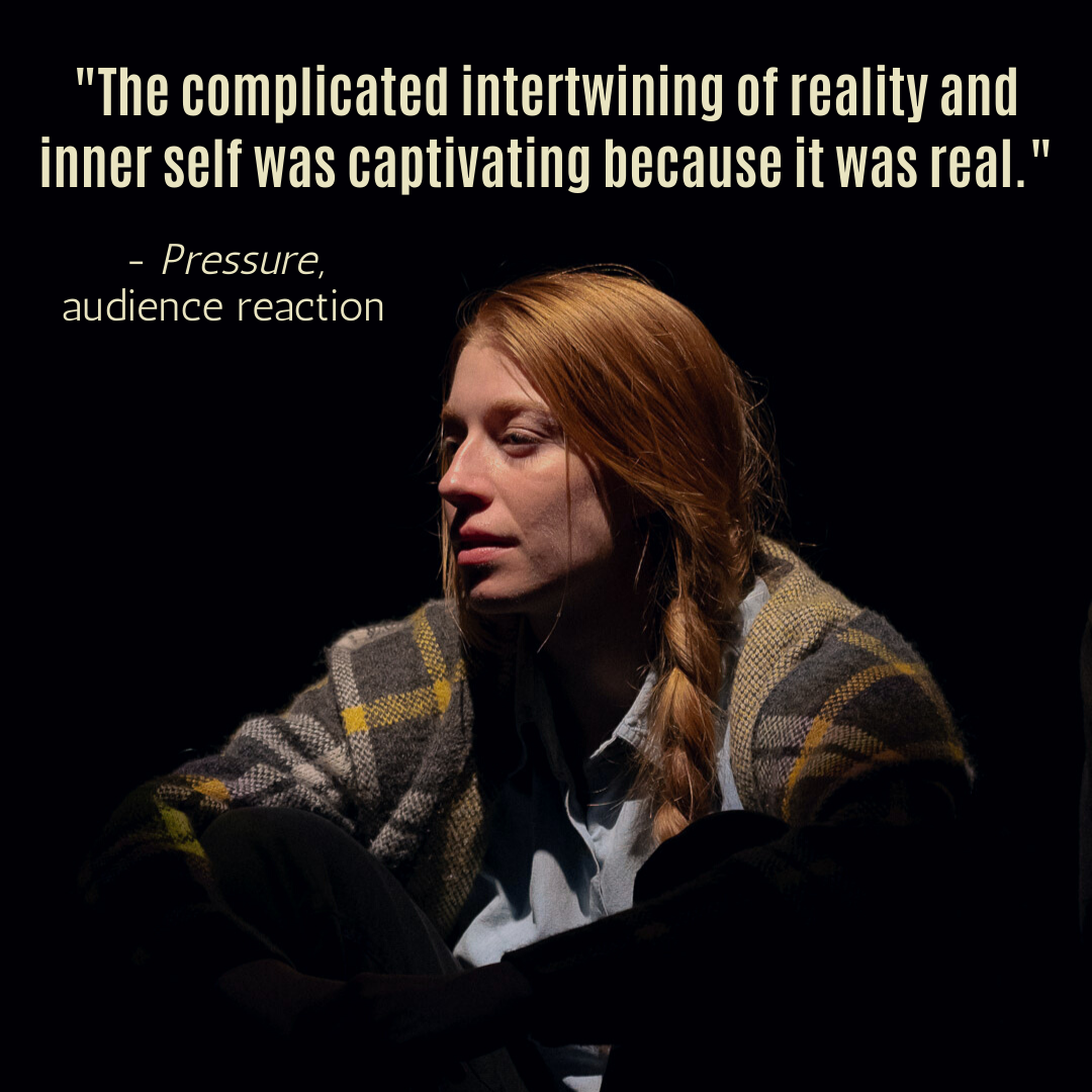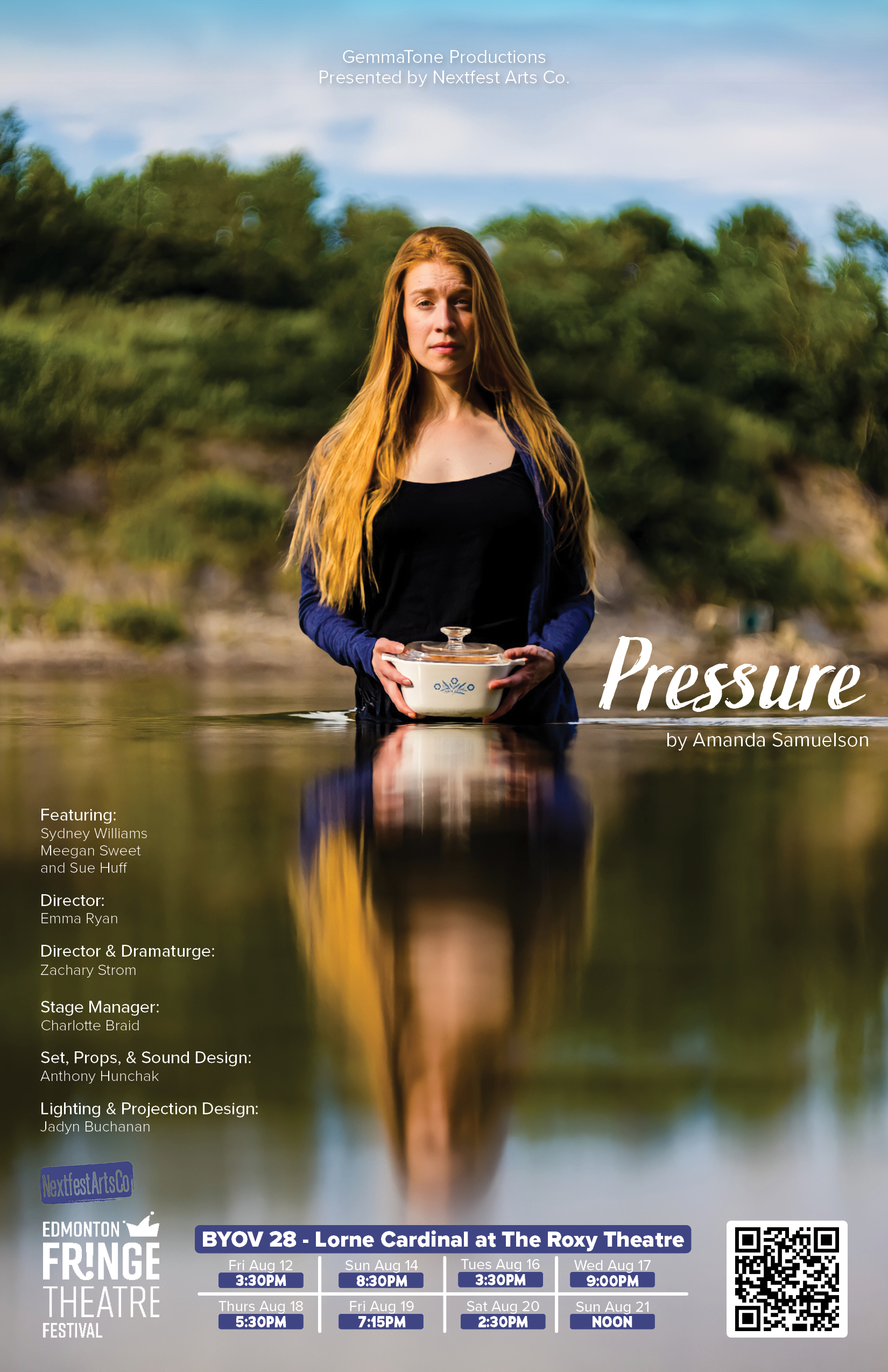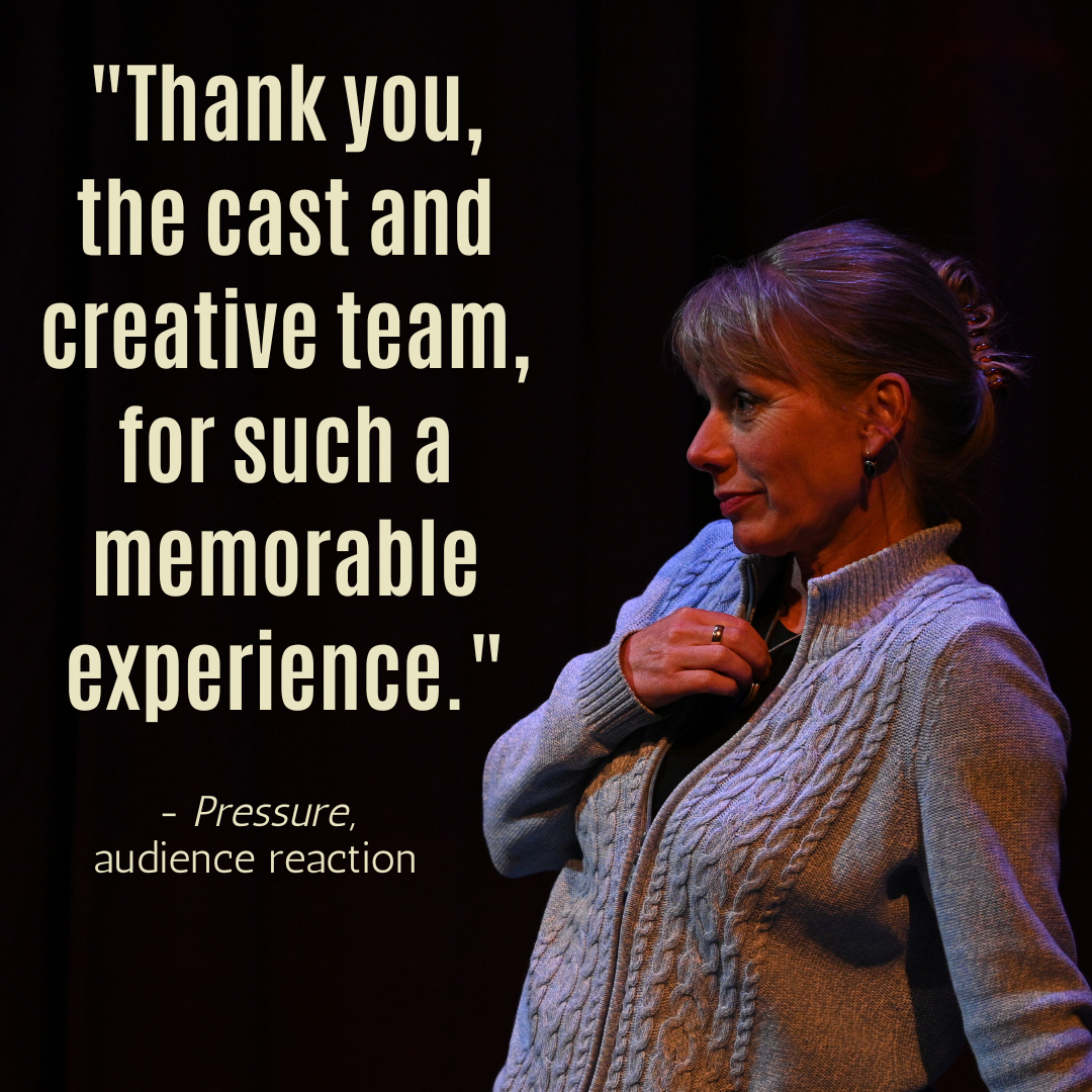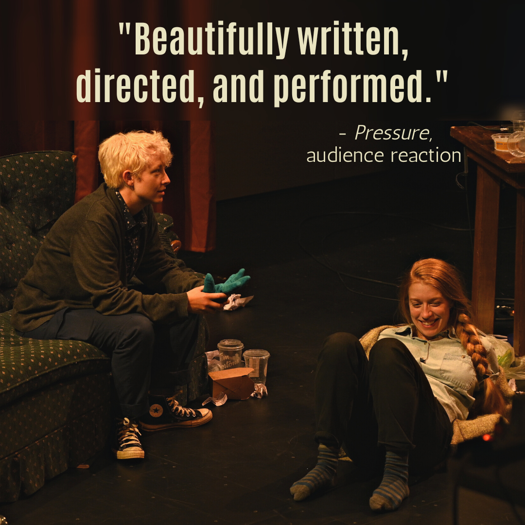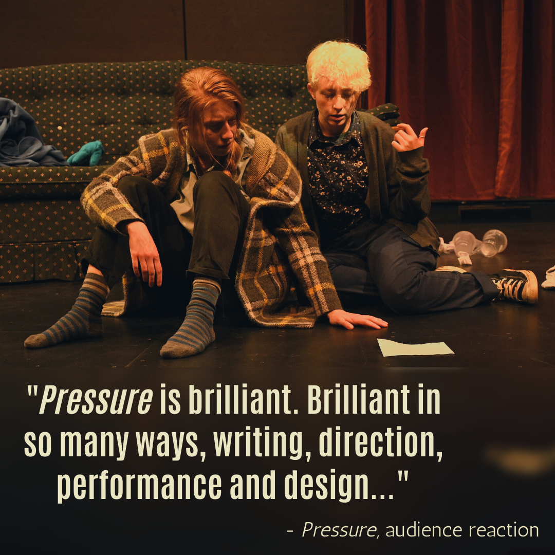 “Pressure, a new and convincingly tough-minded play by the up-and-comer Amanda Samuelson, premiering at the Fringe as Nextfest’s first official cross-festival foray, looks for a theatrical way to explore depression. And the spikiest of the insights it sets forth might well be that the loving concern of everyone around Grace (Sydney Williams) — her stellar mom (Sue Huff), her patient partner and soon-to-be ex Ricky (Meegan Sweet) — who do everything right and are standing by, hands outstretched, are pressure too.” — Liz Nicholls: 12th Night, Fringe Review